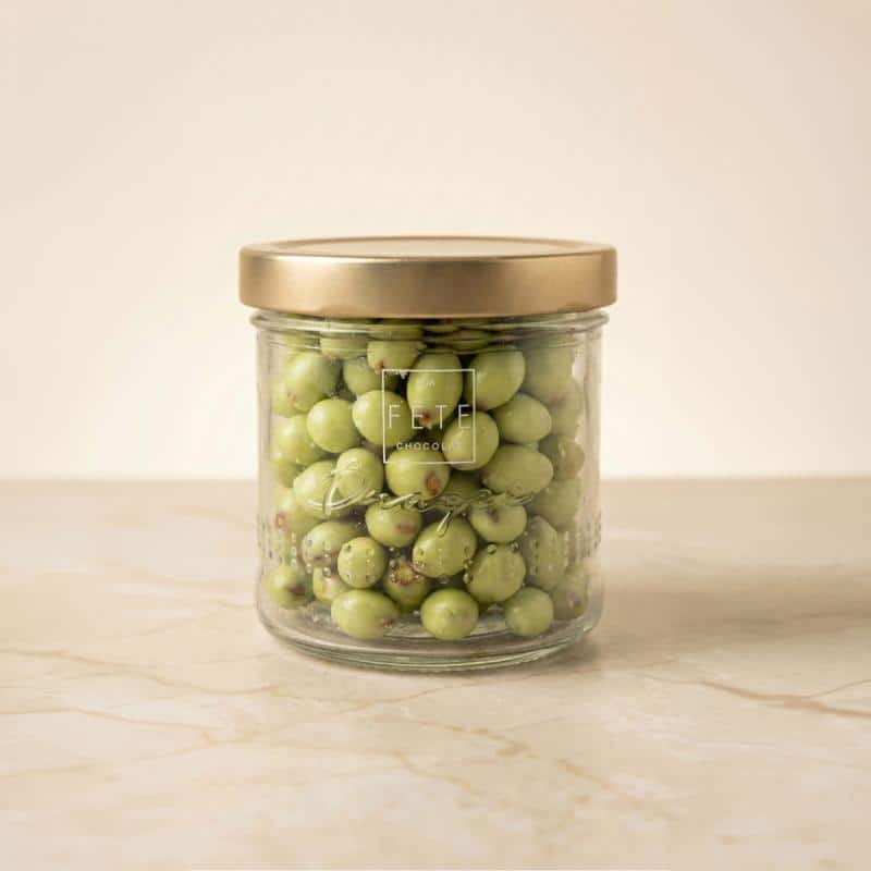 Pistachos tostados cubiertos de chocolate blanco.